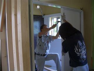 ちょうど壁が建てこまれ入口の引き戸枠が組み込まれました。